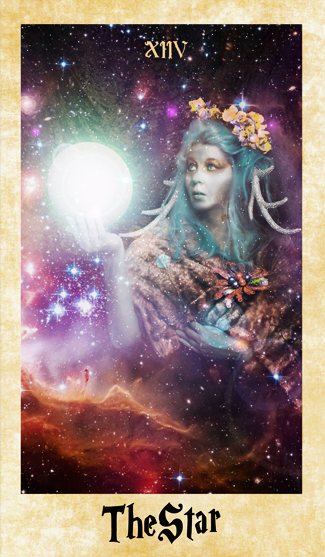 Nadine created the costumes, headpieces, jewelry, and props. She incorporated gemstones for each card to reflect the meanings within the cards. She took the photos of the models in her make-shift home studio on a plain backdrop. Then she ventured out into nature taking additional photos to incorporate the four elements into her creation. She took photos from across New York State for the backgrounds; most are from The Adirondacks. She then mergered the images together in photoshop to create her healing Tarot vision, called The Soul Reflections Tarot. To the left, you see The Star Card. This was the first photo shot took for the project and Nadine was the model. You can see a behind the scene of these shoots on the videos page.