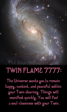 7777 - The Universe wants you to remain happy, content and peaceful within your Twin Flame Journey. Things will manifest quickly. You will feel a soul connection with your Twin.